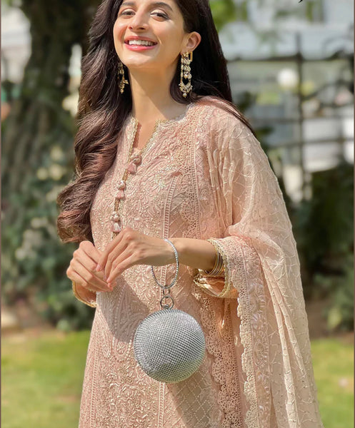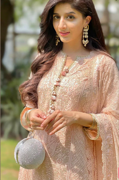This harmoniously detailed outfit rendered in subtle powder pink leaves one mesmerized. This gorgeous chiffon shirt is delicately embroidered in muted thread work with a hint of sophisticated Banarsi Zari along with heavily embroidered full sleeves. Paired with alluring traditional classic gharara adding beauty and elegance to this exclusive design. Complete your look with a chiffon dupatta trimmed with a delicately embroidered border along the edges. This is a perfect outfit to pull out for a summer dress up moment.