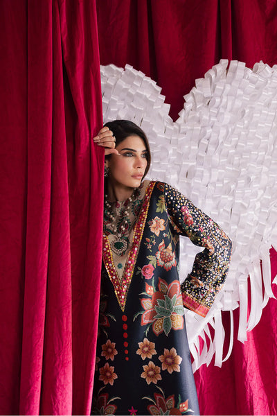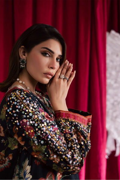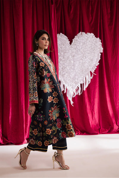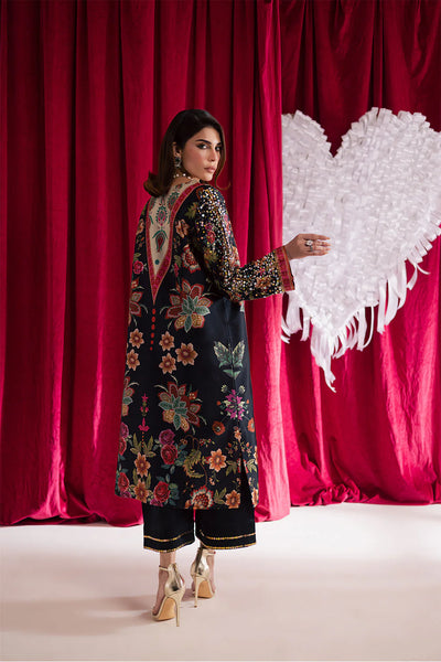 Printed silk shirt with intricate embellishments on the sleeves and neckline, paired with silk embellished straight pants for a refined and stylish ensemble.