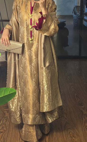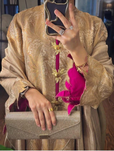 The pure Atlas shawl completes the look, with black jamawar facing underneath flowing with a rich sheen while maintaining its regal drape.