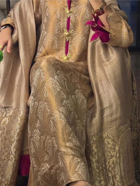 This three-piece set is crafted entirely from pure Atlas fabric, including the shawl. The straight-cut, long shirt is tailored to a length of 48 inches. The neckline features buttons motifs made from dabka and metal. The sleeves are adorned with intricate cutwork detailing, offering a subtle touch of artistry that elevates the overall design.